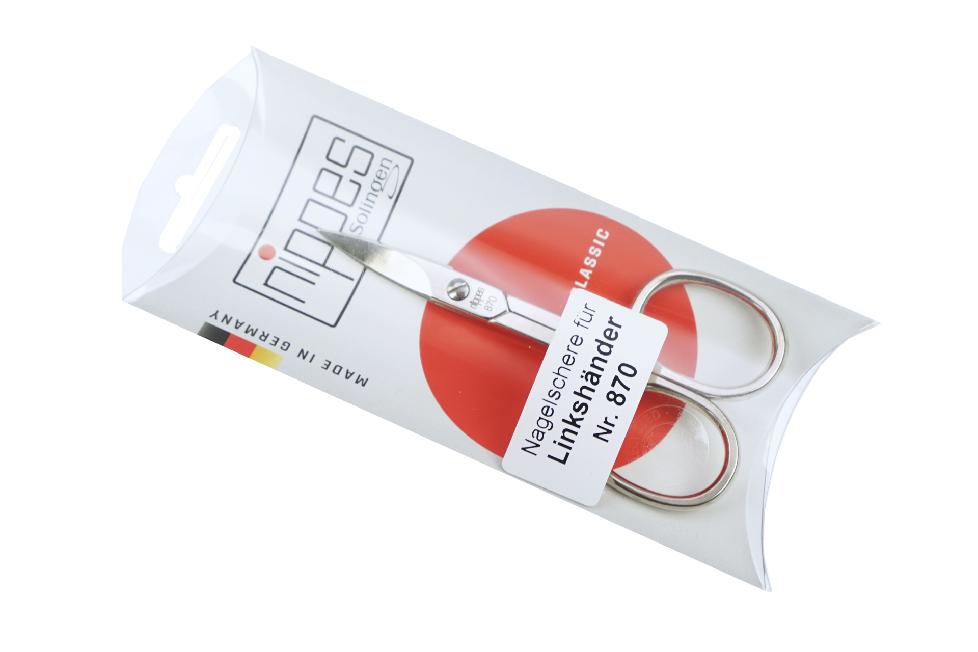 Unsere Klassiker für Linkshänder. Diese vernickelte Nagelschere aus gehärtetem Stahl mit Schließhalm und gebogener Spitze ist das essentielle Werkzeug für die perfekte Maniküre. Länge: 90 mm.