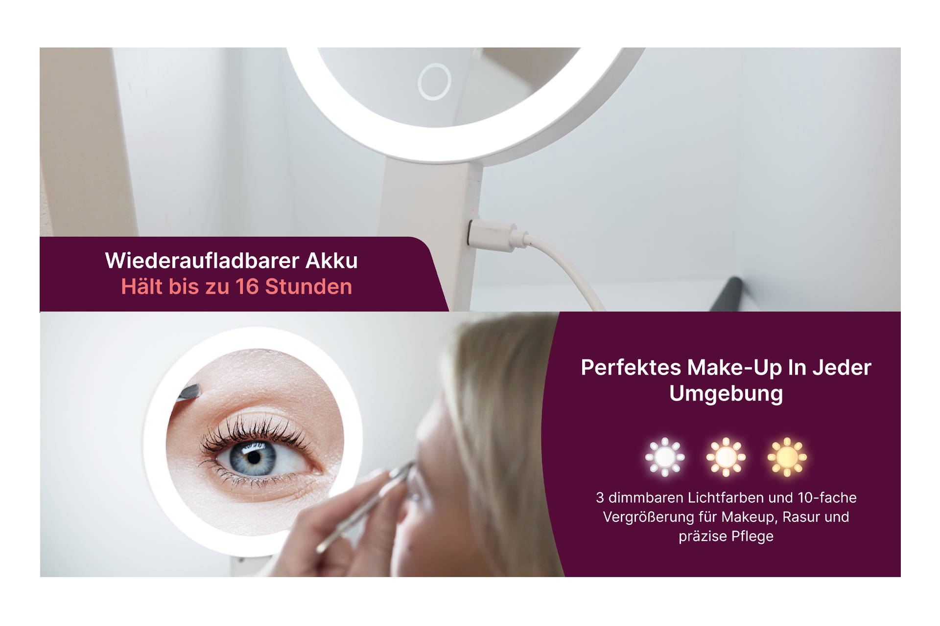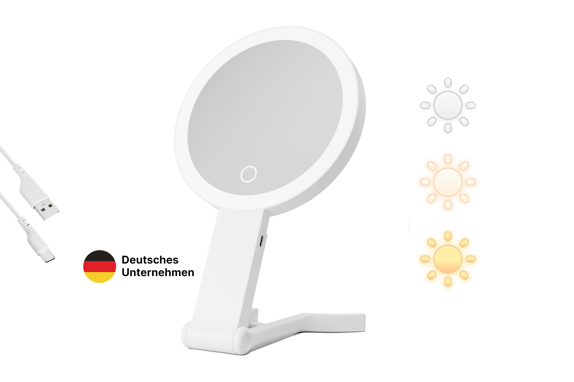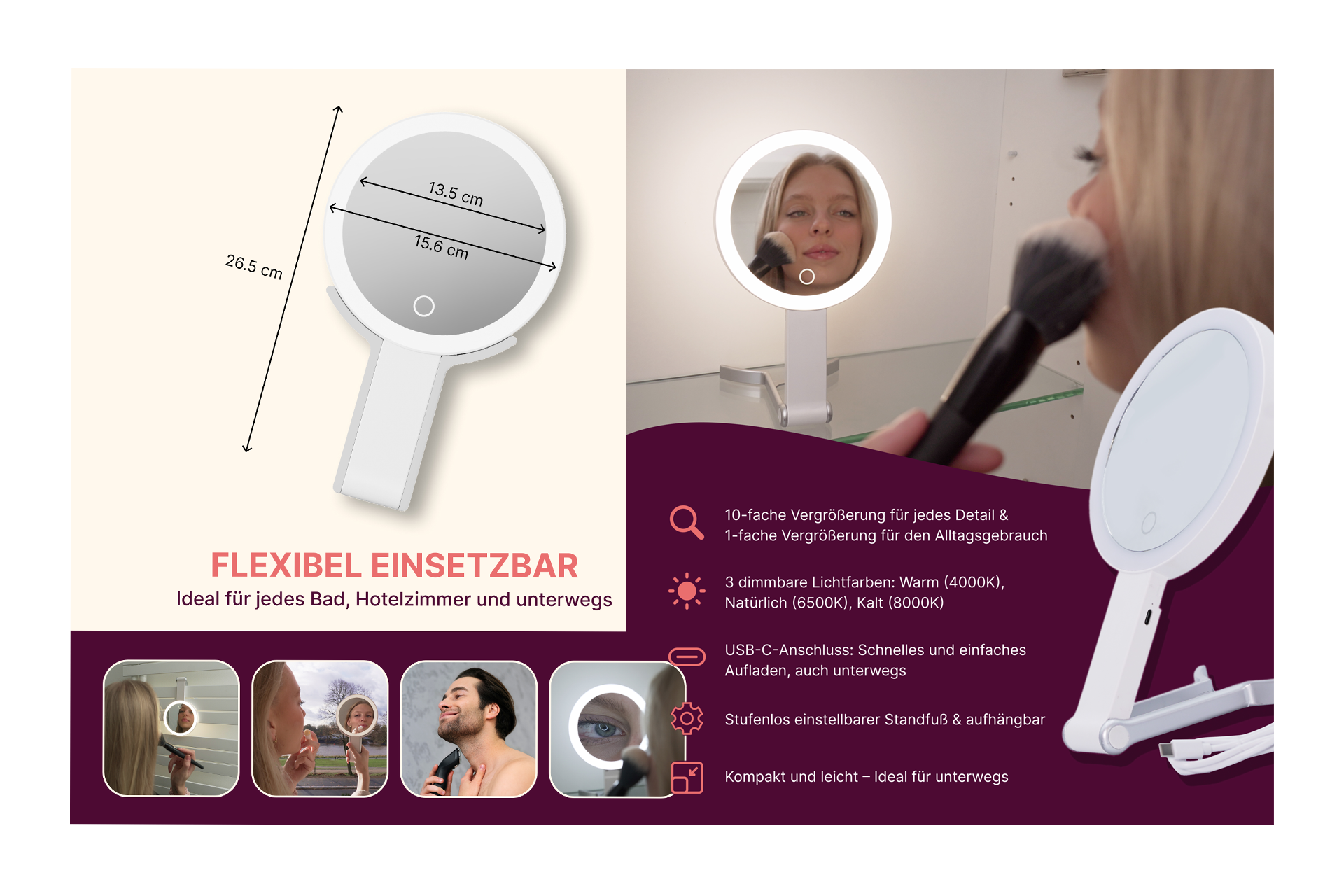 Der Ständer aus silberfarbenen Kunststoff ist Stufenlos in jeder Höhe einstellbar und ganz aufgeklappt können Sie ihn auch aufhängen. Der Spiegel ist Aufladbar mit beiliegendem USB-C-Kabel (1200 mAh) Die Masse: Länge aufgeklappt: 37,5 cm , eingeklappt: 26,5, Durchmesser: 15,6 cm