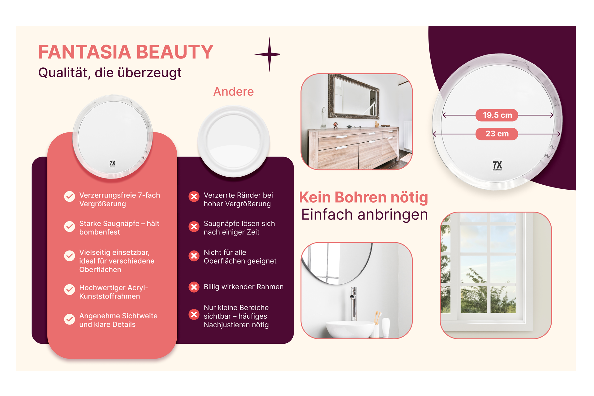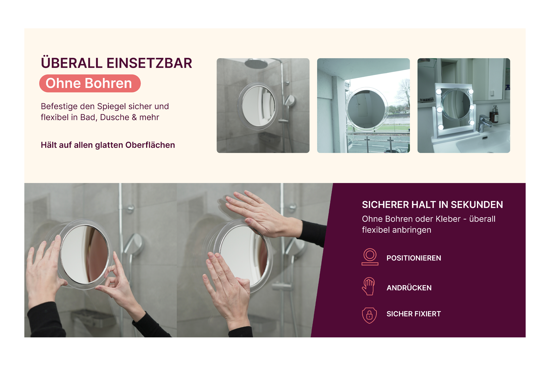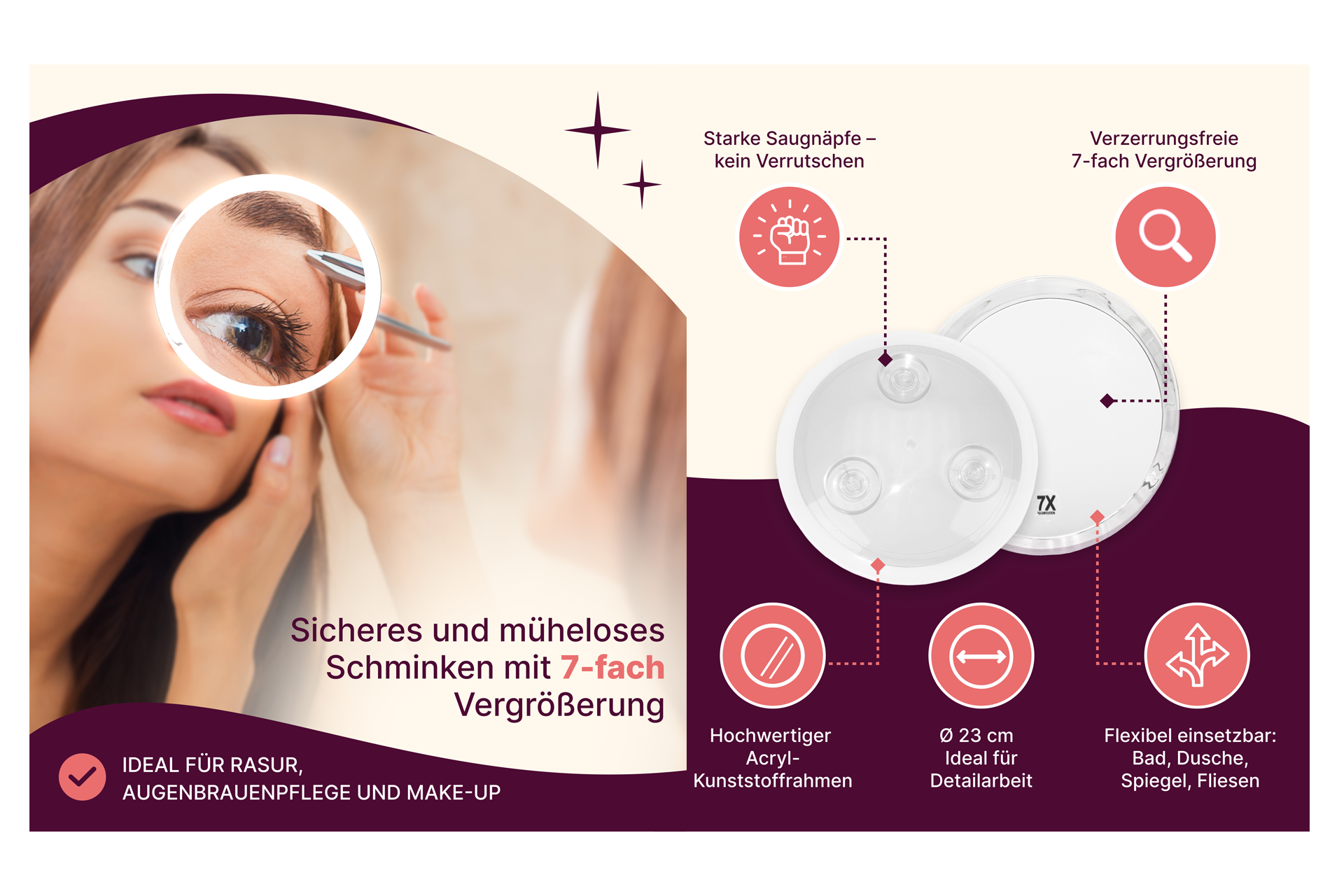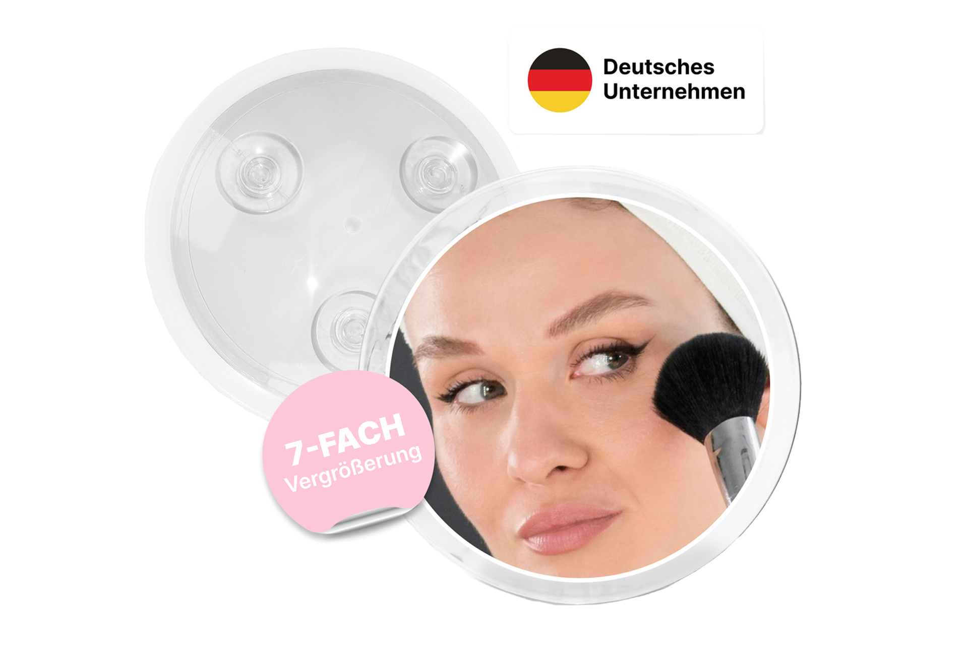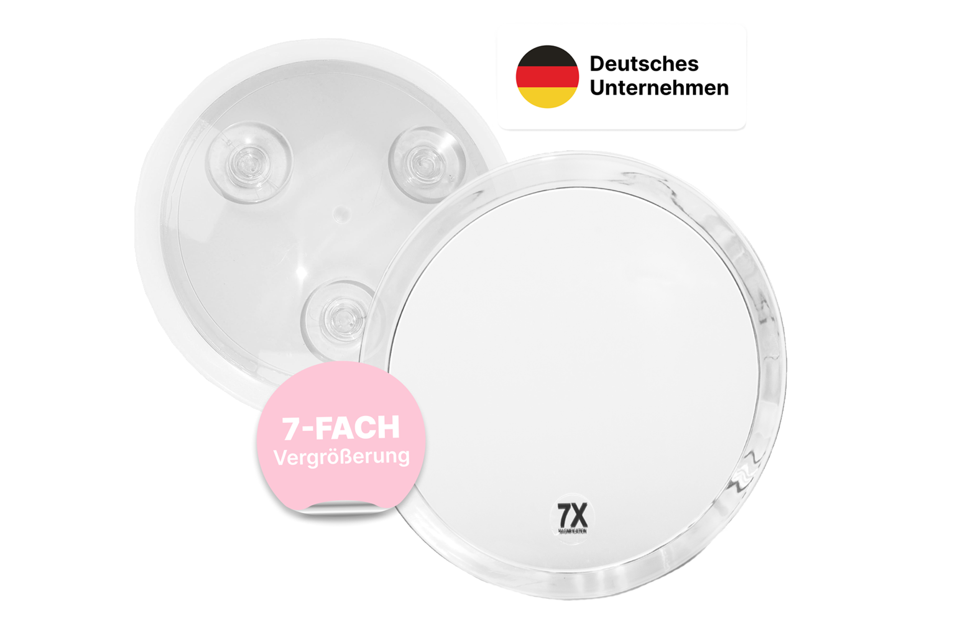 Der Spiegel hat eine 7-fache Vergrößerung, dadurch werden die Details Ihrer Haut, Rasur und Frisur deutlich sichtbar. Perfekt zum Schminken und Rasieren! Wandspiegel 23 cm groß mit Acryl Kunststoff-Rahmen. Dank der starken Saugnäpfe kann der Spiegel auf allen sauberen und glatten Oberflächen wie Glas, Kunststoff, Spiegel, Fliesen usw. haften. Einfache Anbringung im Badezimmer, in der Dusche, am Fenster, im Bad oder im Gäste-WC ohne zu bohren.