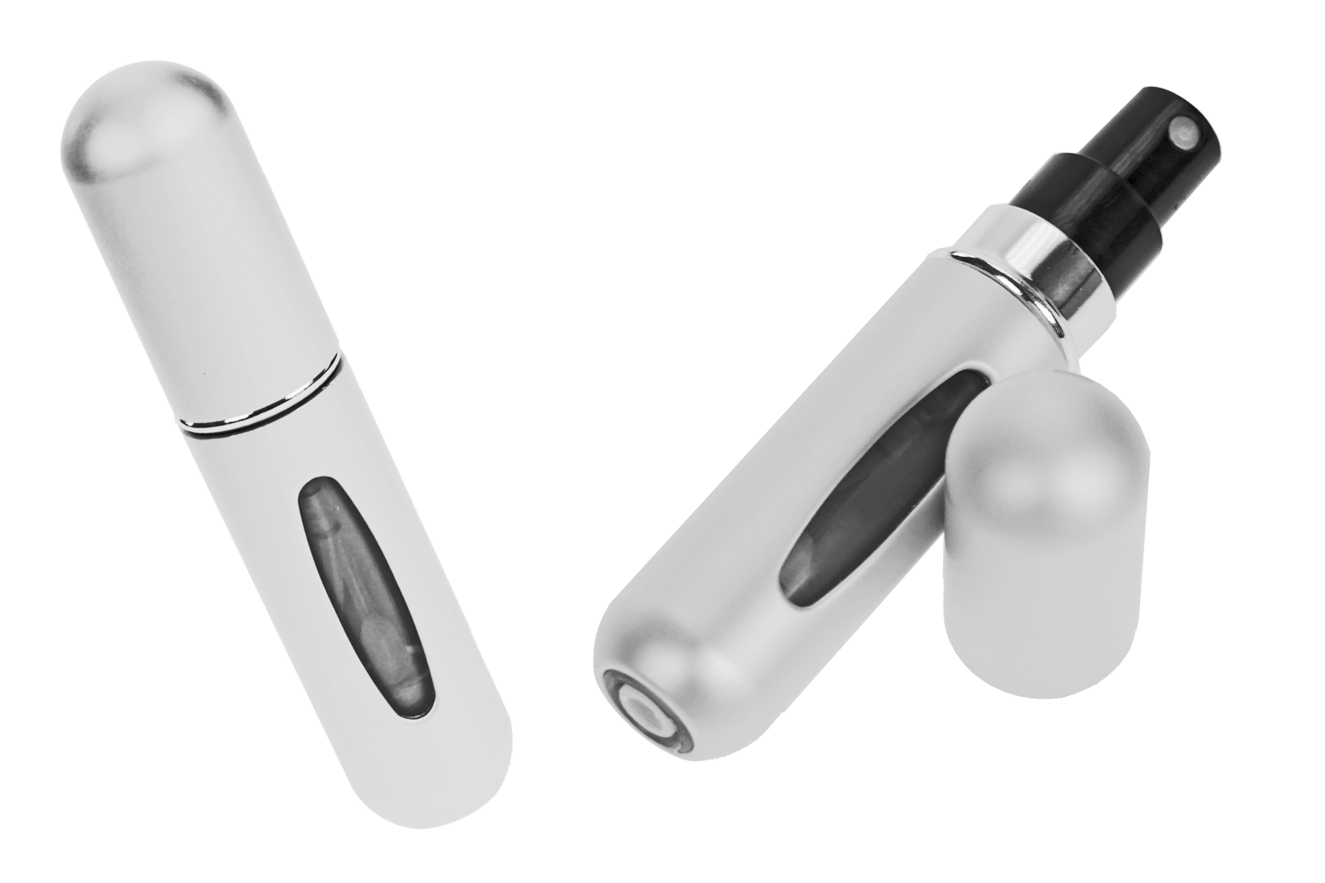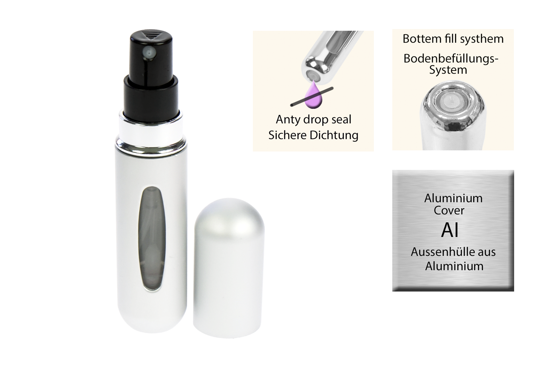 Durch Pumpbewegungen füllt sich der kleine Zerstäuber leicht ohne Verschwendung. Duch das Sichtfenster ist der Füllstand ganz einfach abzulesen. Für 5 ml Inhalt, leer. Aluminium und Kunststoff.