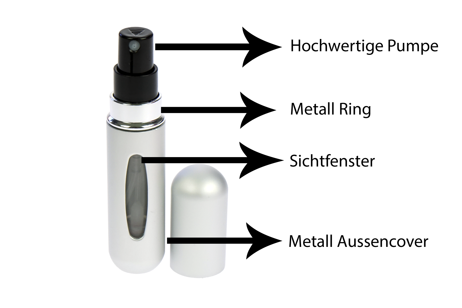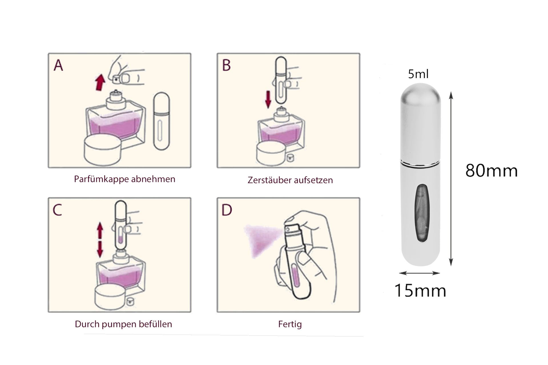 Sie brauchen nur den Sprüh-Kopf der Original-Flasche abzunehmen und diesen Taschenzerstäuber mit dem unteren Ende aufdrücken.