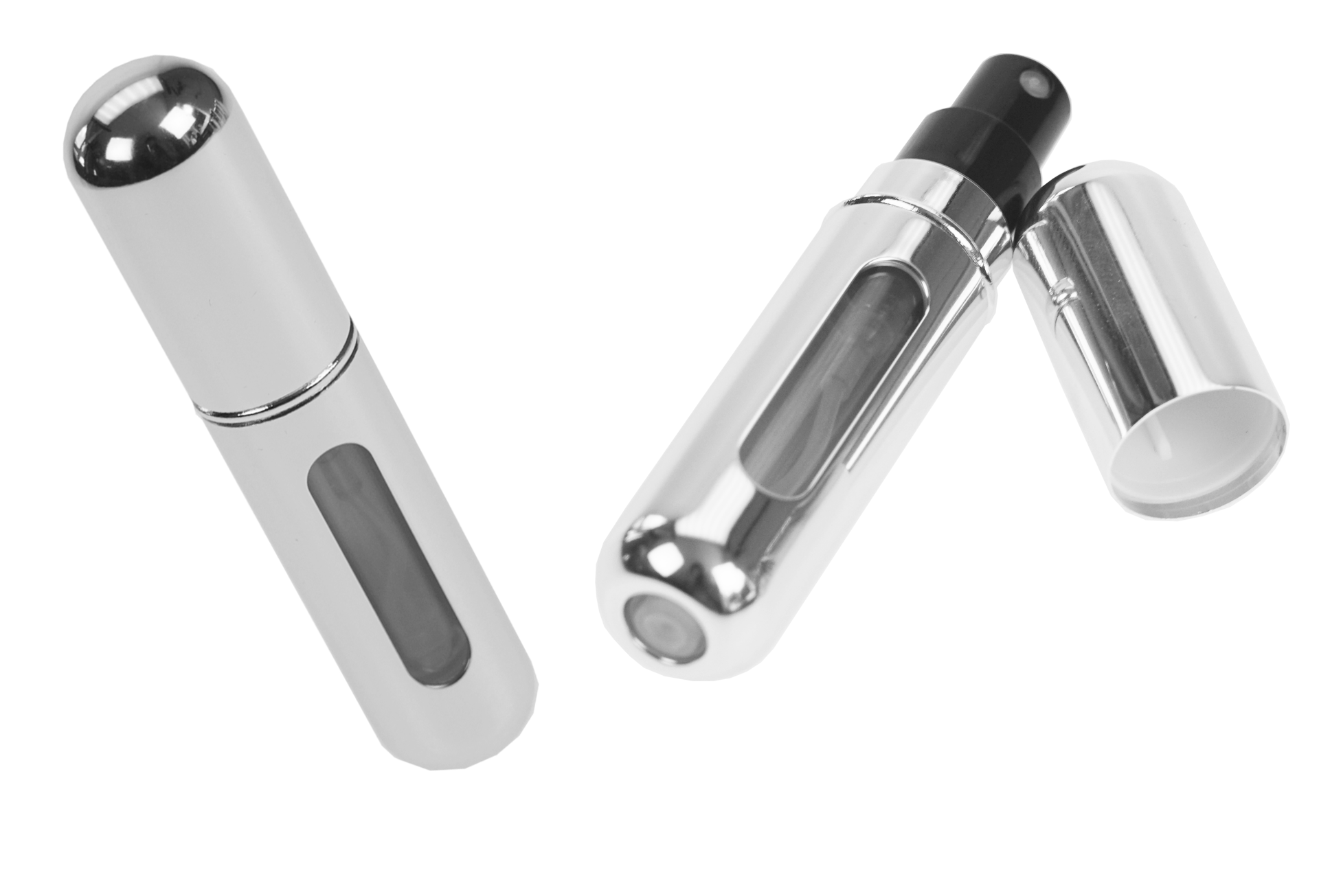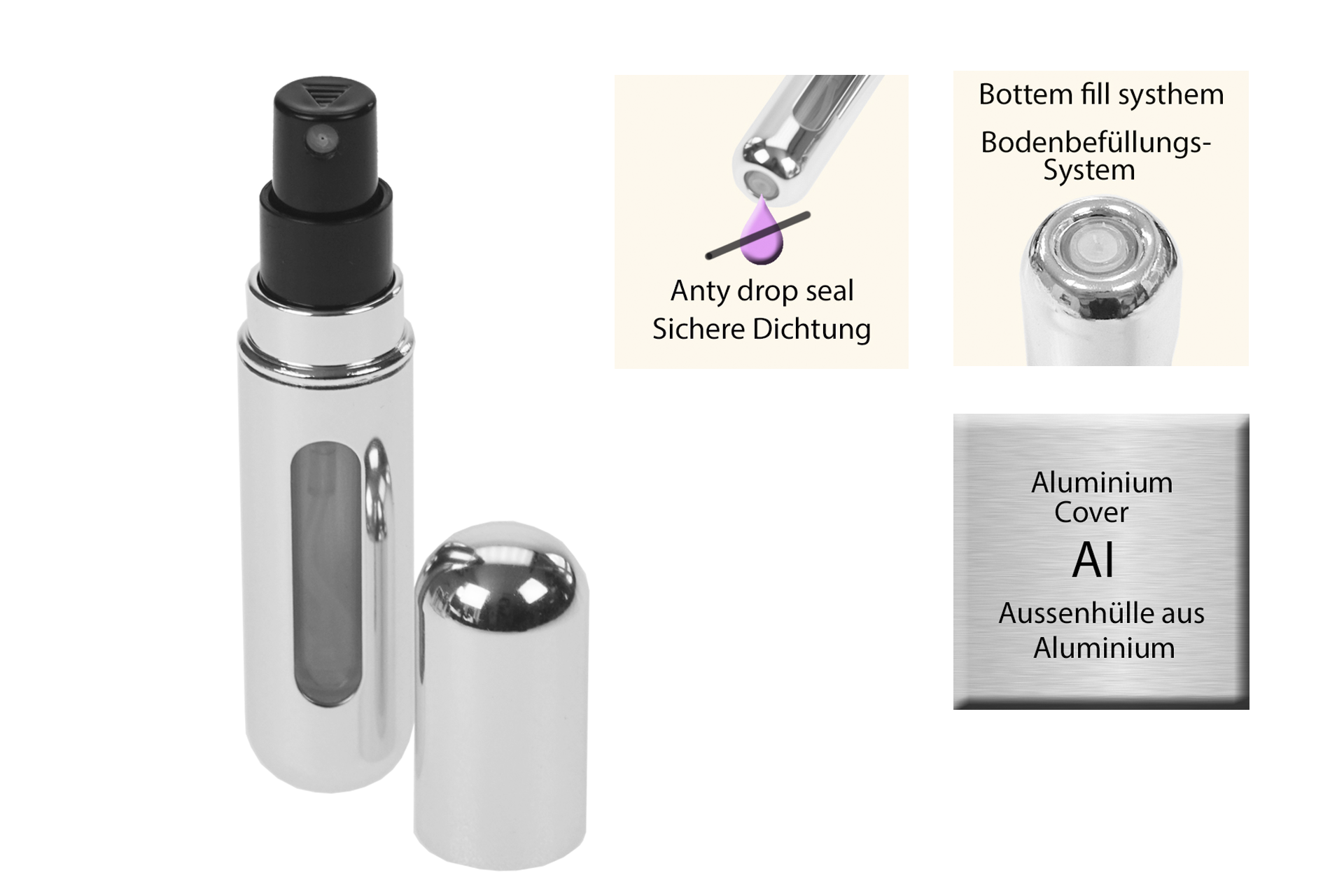 Durch Pumpbewegungen füllt sich der kleine Zerstäuber leicht ohne Verschwendung. Duch das Sichtfenster ist der Füllstand ganz einfach abzulesen. Für 5 ml Inhalt, leer. Aluminium und Kunststoff.