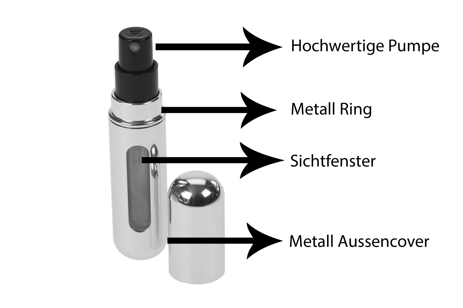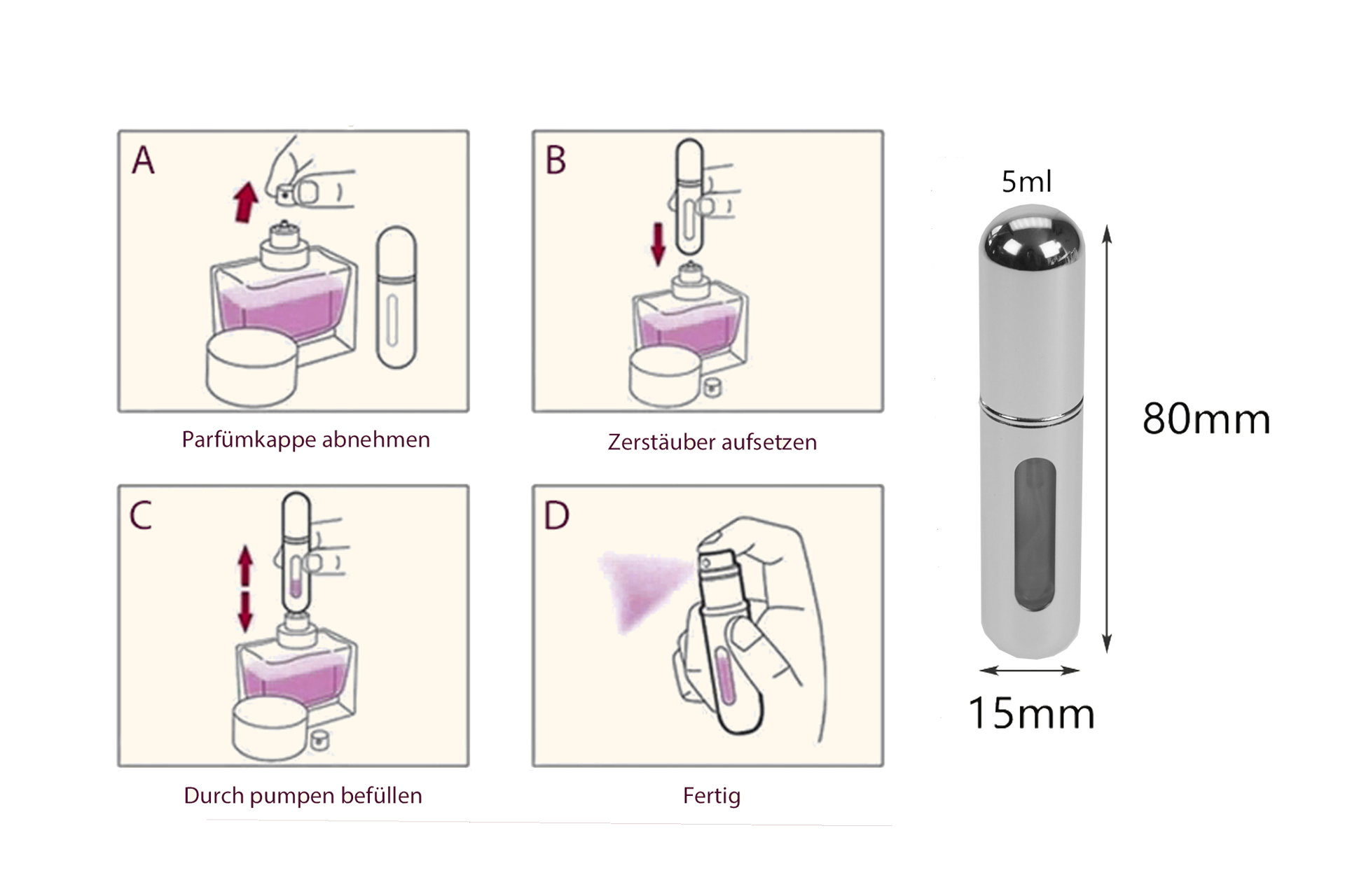 Sie brauchen nur den Sprüh-Kopf der Original-Flasche abzunehmen und diesen Taschenzerstäuber mit dem unteren Ende aufdrücken.