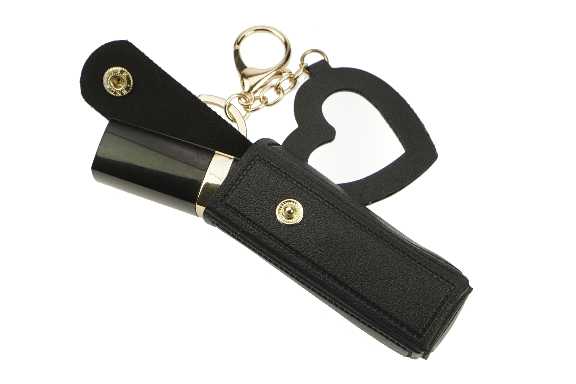 Fashionable lipstick and pocket atomizer bag with snap fastener, small heart-shaped mirror, and keychain snap hook, black