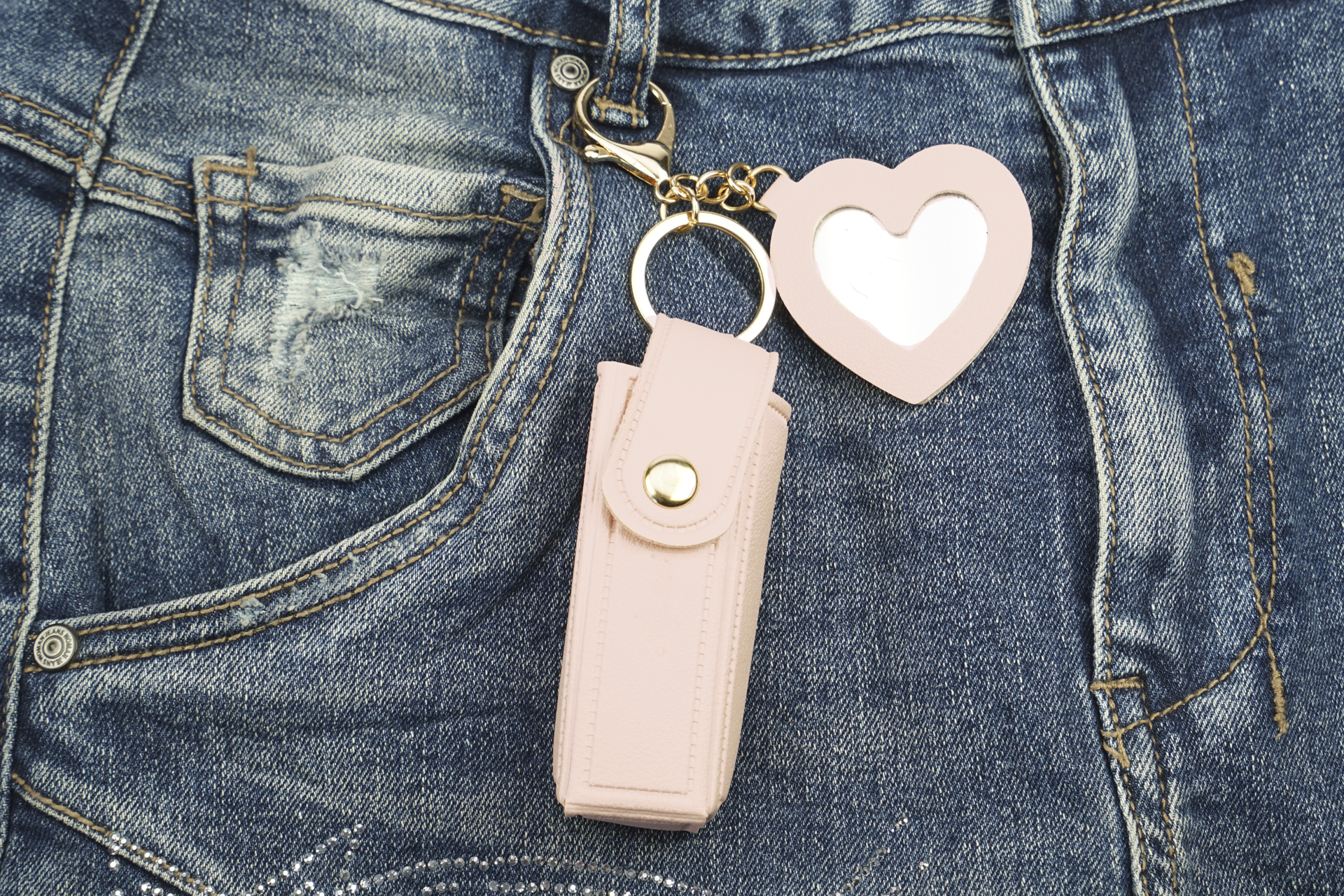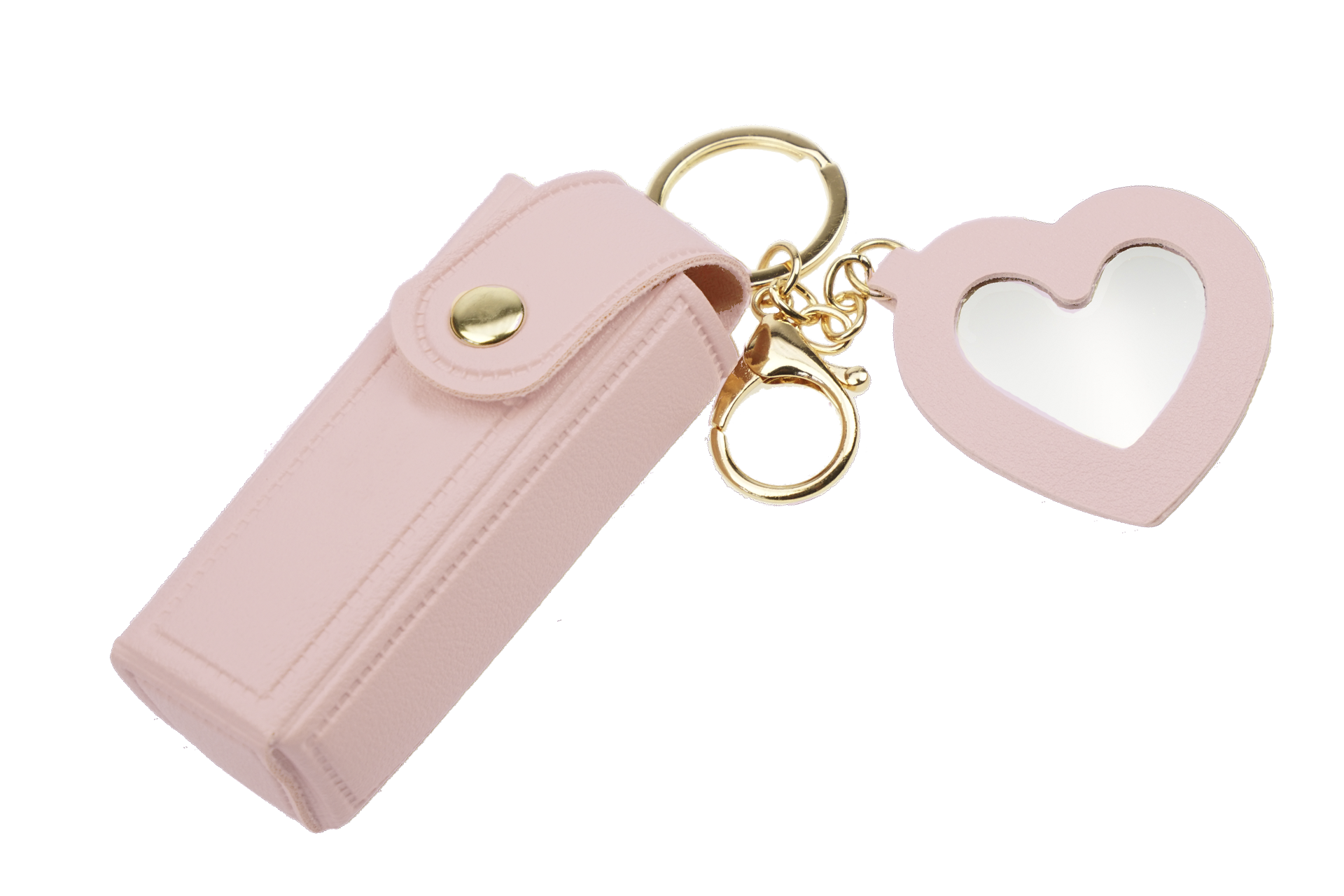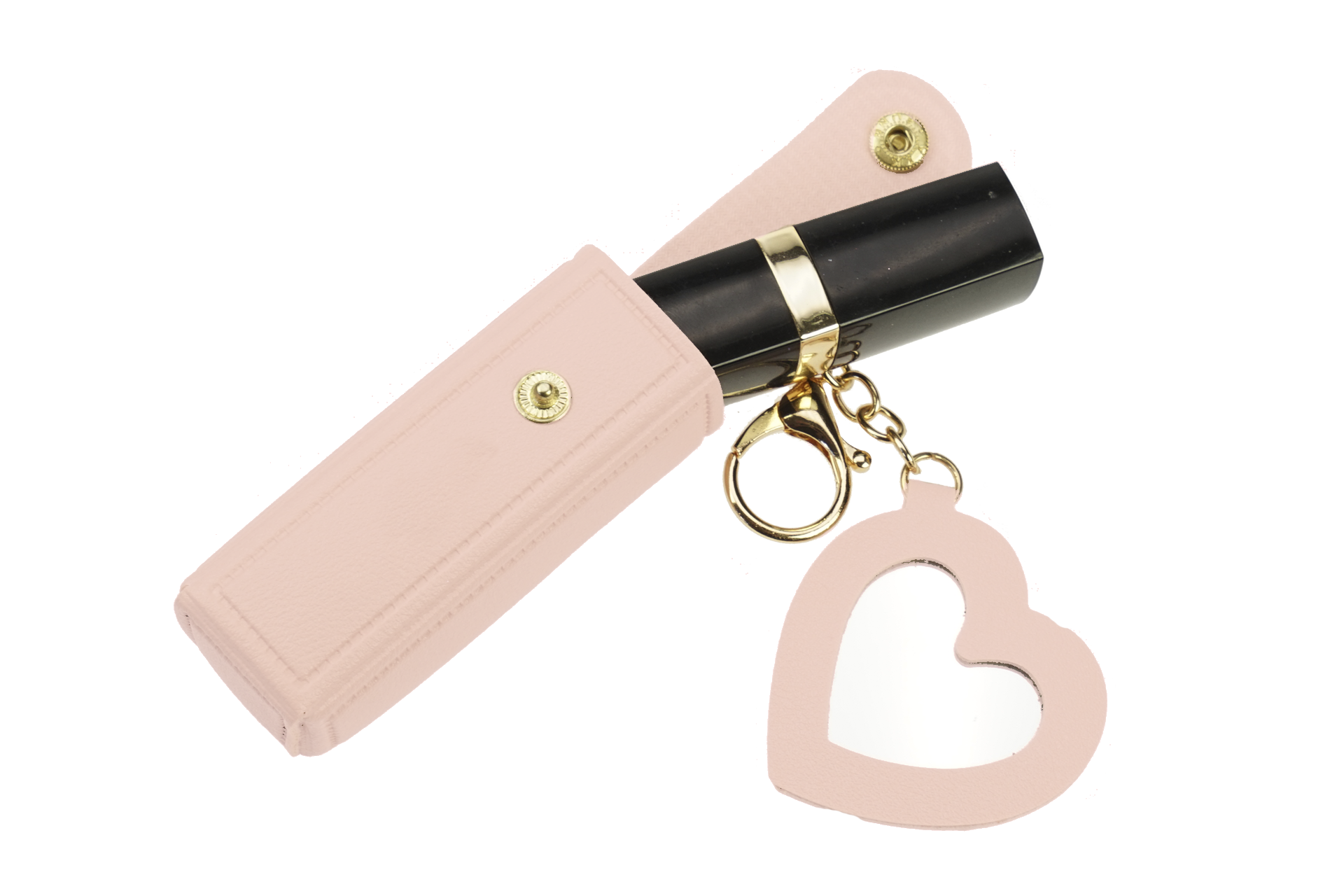 Fashionable lipstick and pocket atomizer bag with snap fastener, small heart-shaped mirror, and keychain snap hook, pink