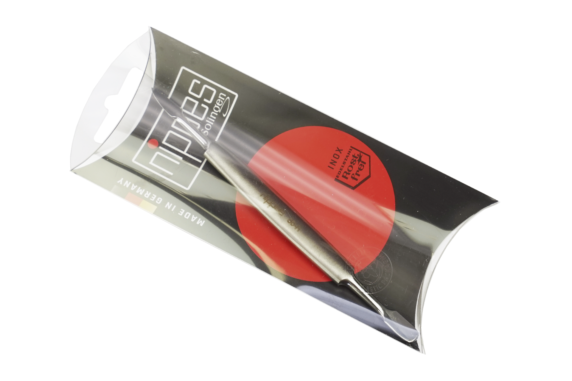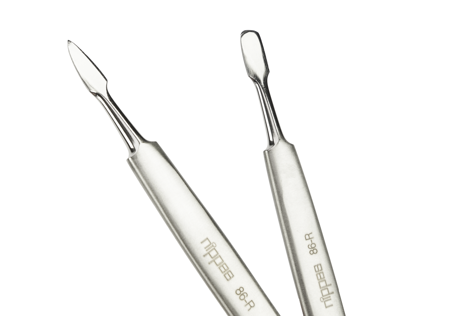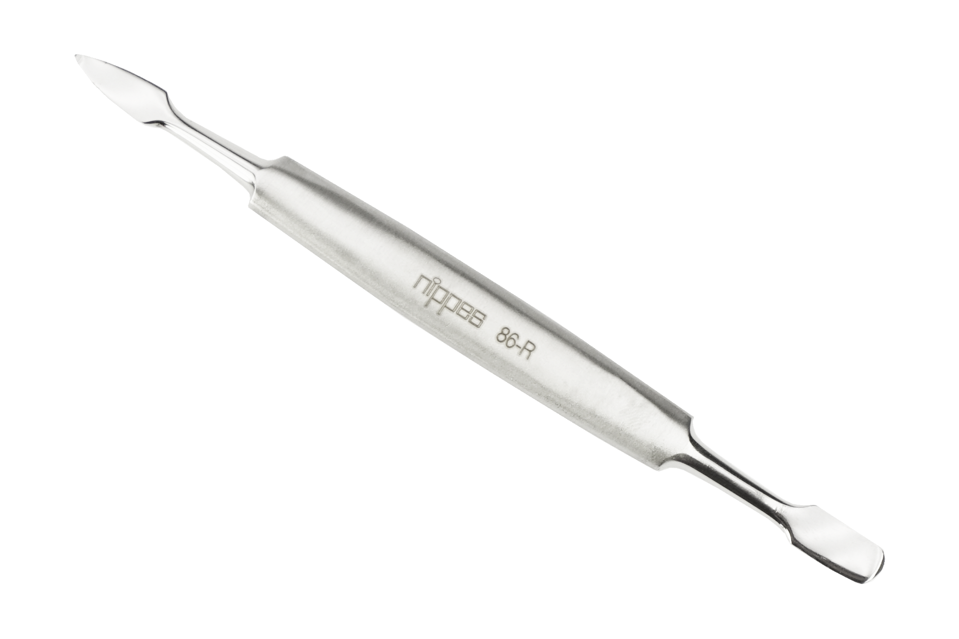 The double instrument has 2 different ends, one with a flat end and one with a slightly curved tip. Use the flat end to gently push back the soaked cuticle and the curved tip to clean the underside of the nail and the nail folds. the underside of the nail and the nail folds. Sturdy and durable instrument, made entirely of stainless steel. Quality from Nippes!