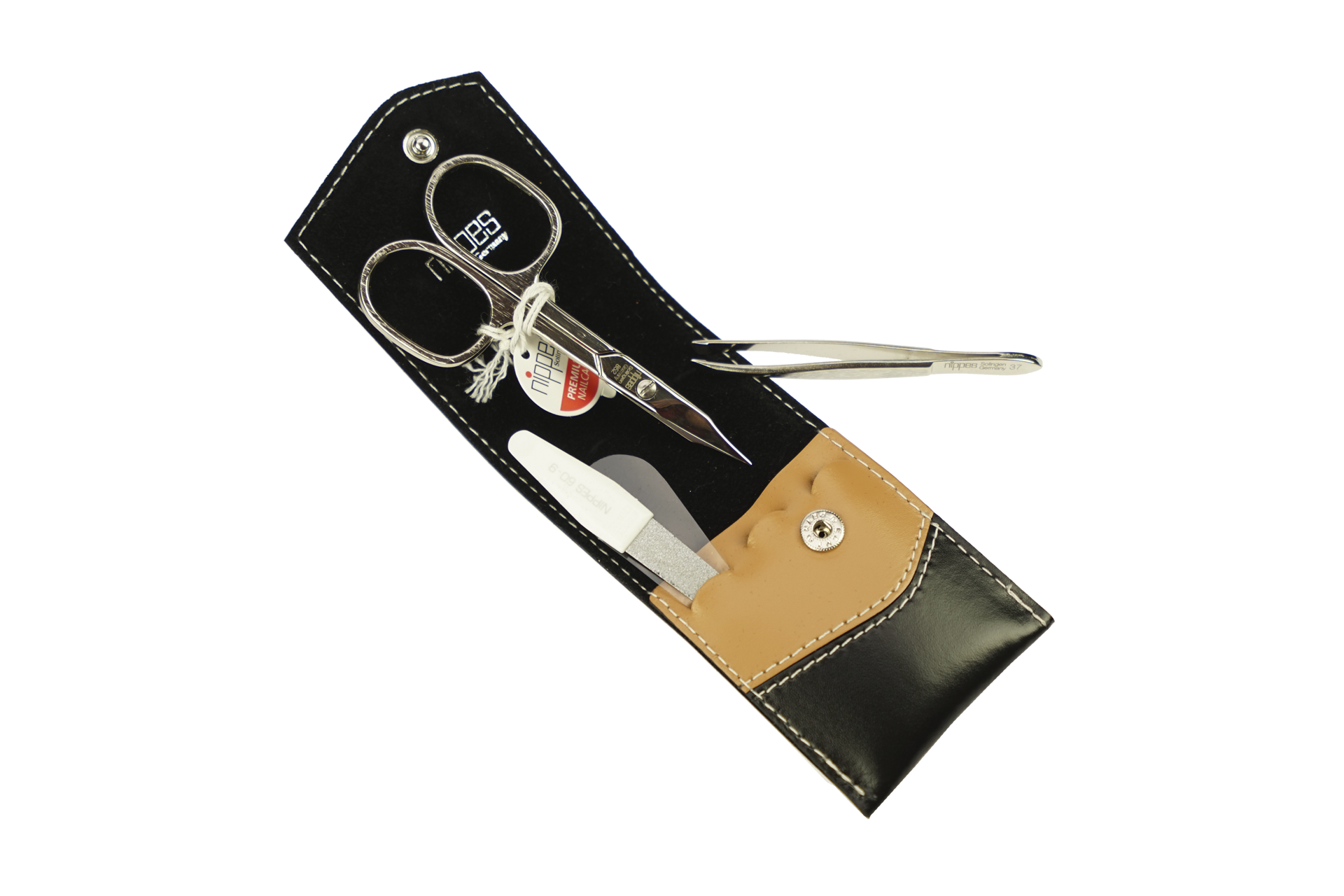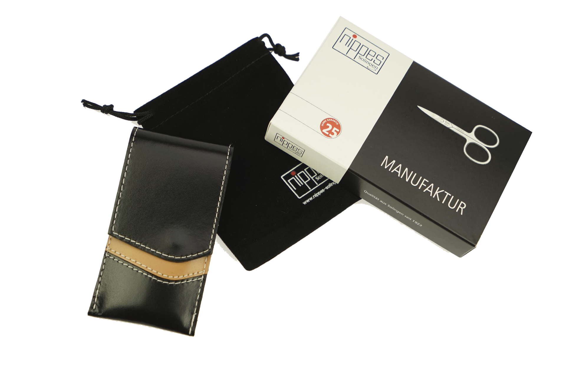 The little black for on the go. Manicure to go, in the most inopportune moments the mishap happens, the nail tears or breaks, then you quickly need a suitable instrument to repair the damage. With this pocket case, you always have everything with you. The manicure set contains the three most important items for quick and uncomplicated nail care: combined cuticle and nail scissors, a sapphire file and tweezers. The manicure case is sewn from high-quality, smooth cowhide leather, the brown appliqué and the shape of the fastening flap give the set its elegance. The instruments from Solingen are made of high-quality nickel-plated steel. At 100 x 50 x 15 mm, the set fits in any pocket and will be your daily companion. Like all our products, the tools in this manicure set are handmade in Solingen from the best Solingen steel. Quality for the highest demands.