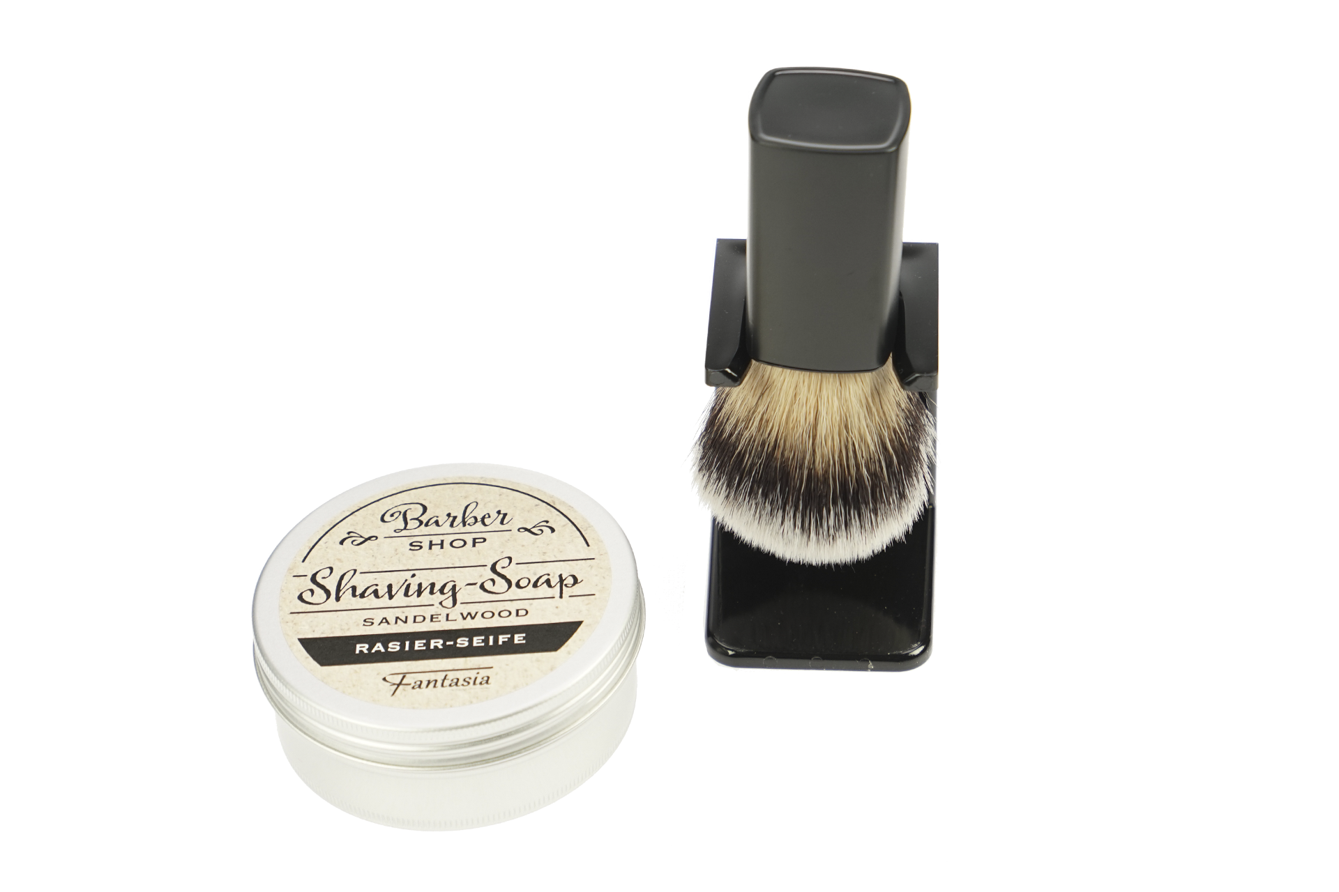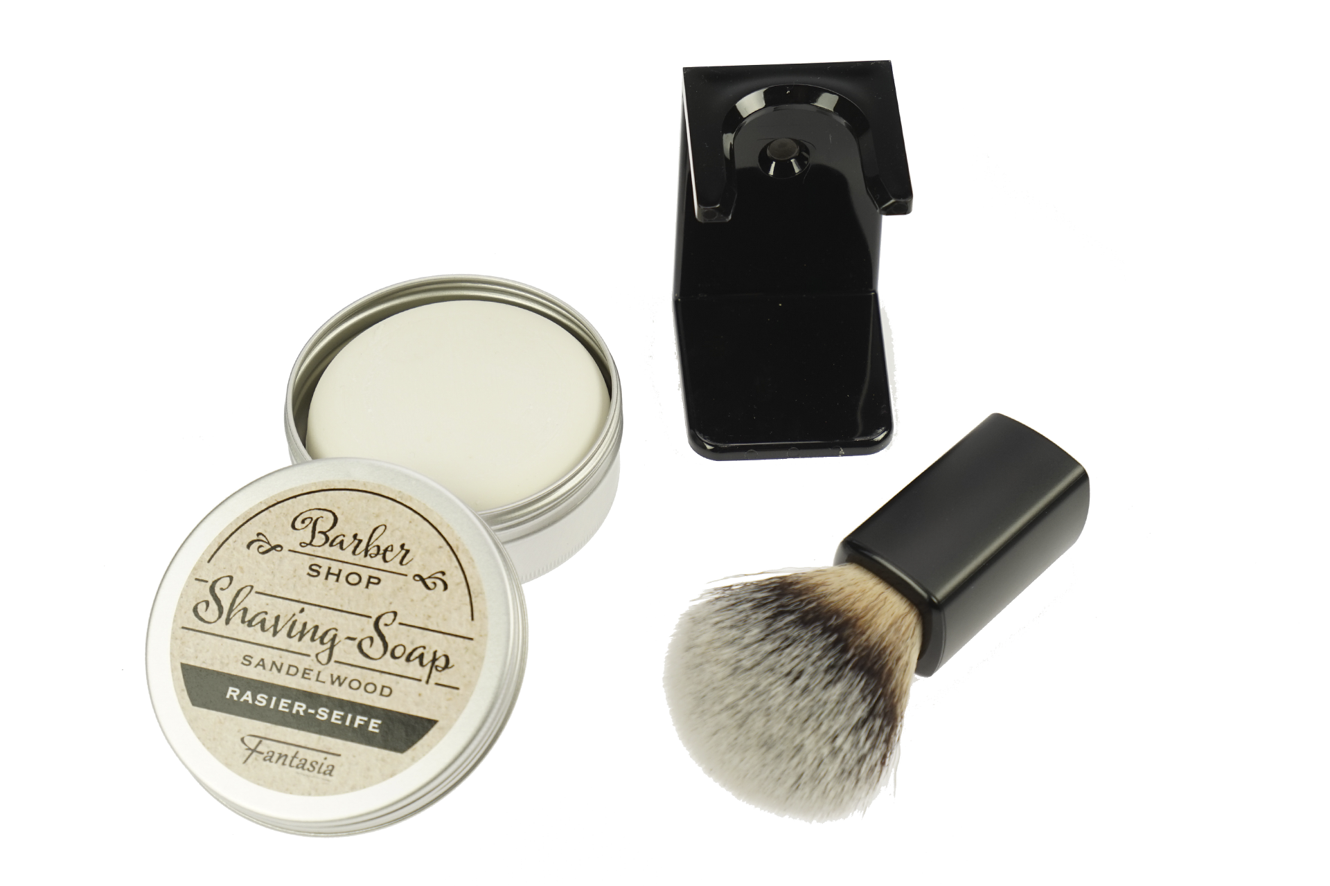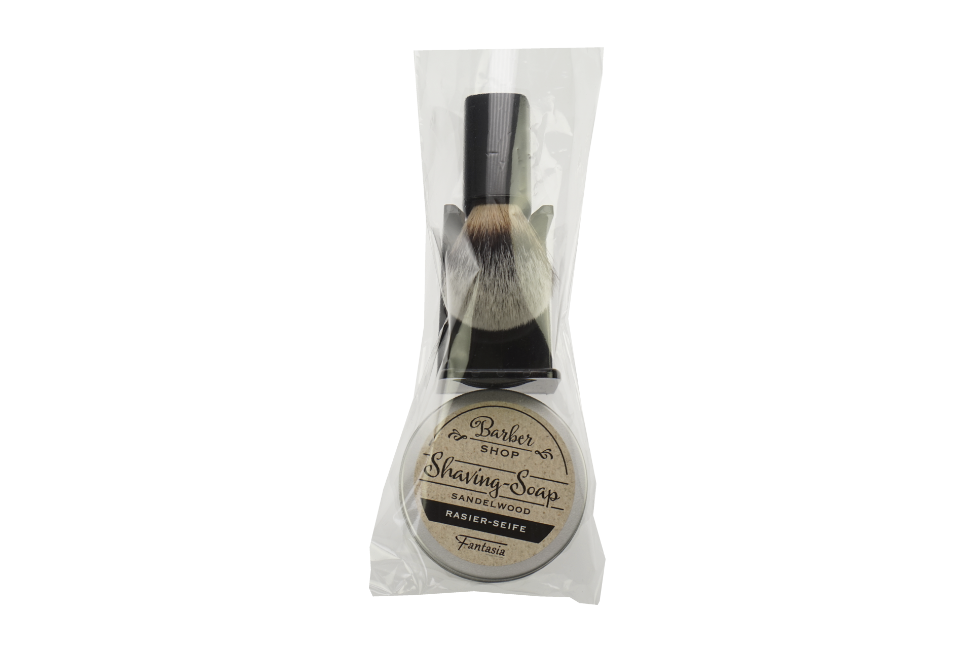 The shaving brush holder made of black plastic not only provides a great presentation for your brush, but also ensures that it dries quickly and remains in the best conditionThe shaving brush has synthetic bristles that are particularly soft and durable. It sits comfortably in the hand and is perfect for a close shave. Shaving brush in black plastic handle with synthetic hair. Nice gift set for men. The sandalwood soap creates a perfect lather and a gentle shaving cream for classic wet shaving and nourished skin. Comes in a reusable tin. Vegan shaving soap with natural ingredients based on pure plant oils. The lather ensures a smooth shave, nourishes, and moisturizes. For sensitive and normal skin. A delicate scent of sandalwood essential oil: The lather has a natural fragrance and provides a refreshing shave. The shaving soap tin also serves as a shaving bowl for lathering