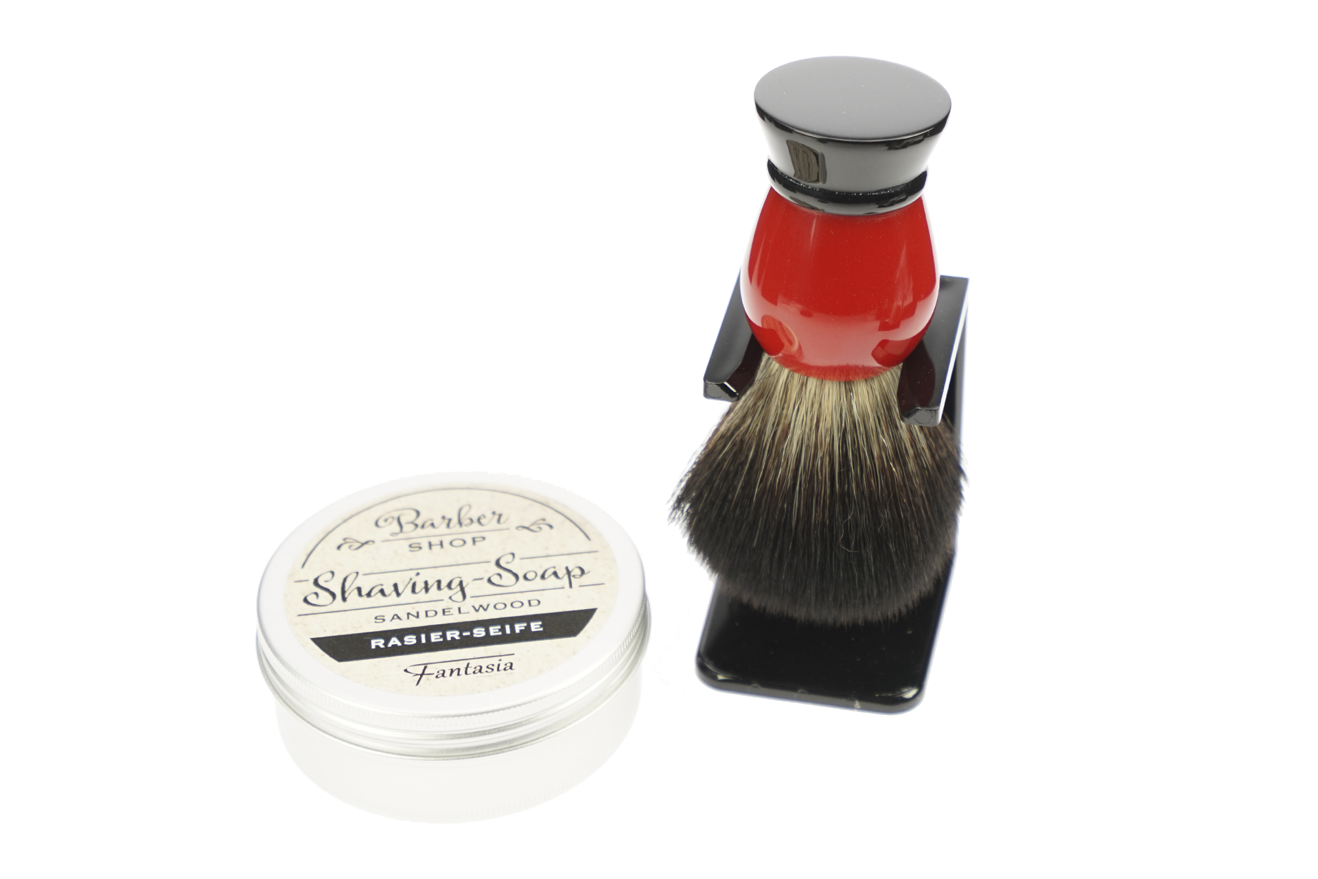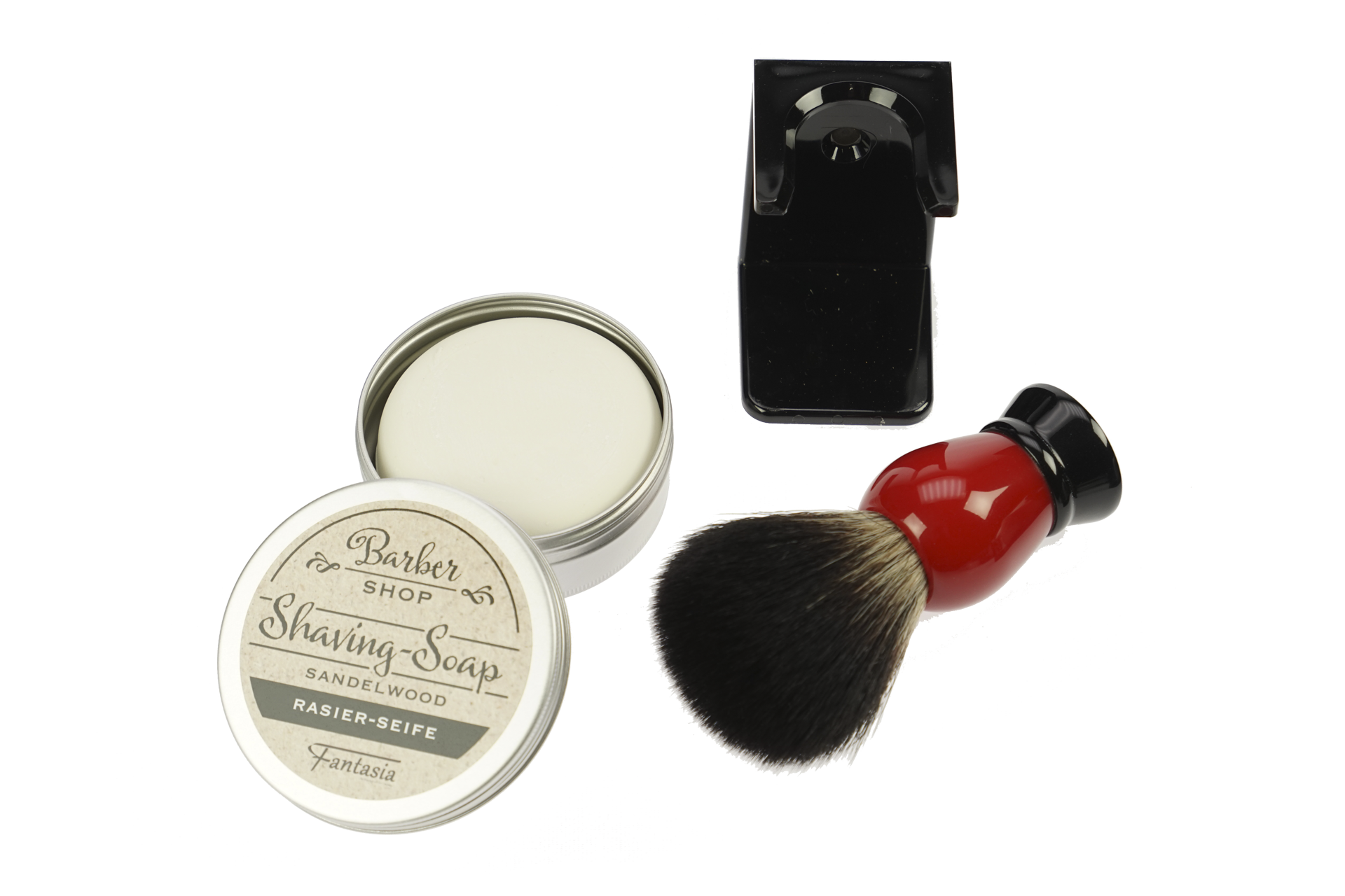 The shaving brush holder made of black plastic not only provides a great presentation for your brush, but also ensures that it dries quickly and remains in the best conditionThe shaving brush has synthetic bristles that are particularly soft and durable. It sits comfortably in the hand and is perfect for a close shave. Shaving brush in retro design: red/black plastic handle with synthetic hair. Nice gift set for men. The sandalwood soap creates a perfect lather and a gentle shaving cream for classic wet shaving and nourished skin. Comes in a reusable tin. Vegan shaving soap with natural ingredients based on pure plant oils. The lather ensures a smooth shave, nourishes, and moisturizes. For sensitive and normal skin. A delicate scent of sandalwood essential oil: The lather has a natural fragrance and provides a refreshing shave. The shaving soap tin also serves as a shaving bowl for lathering