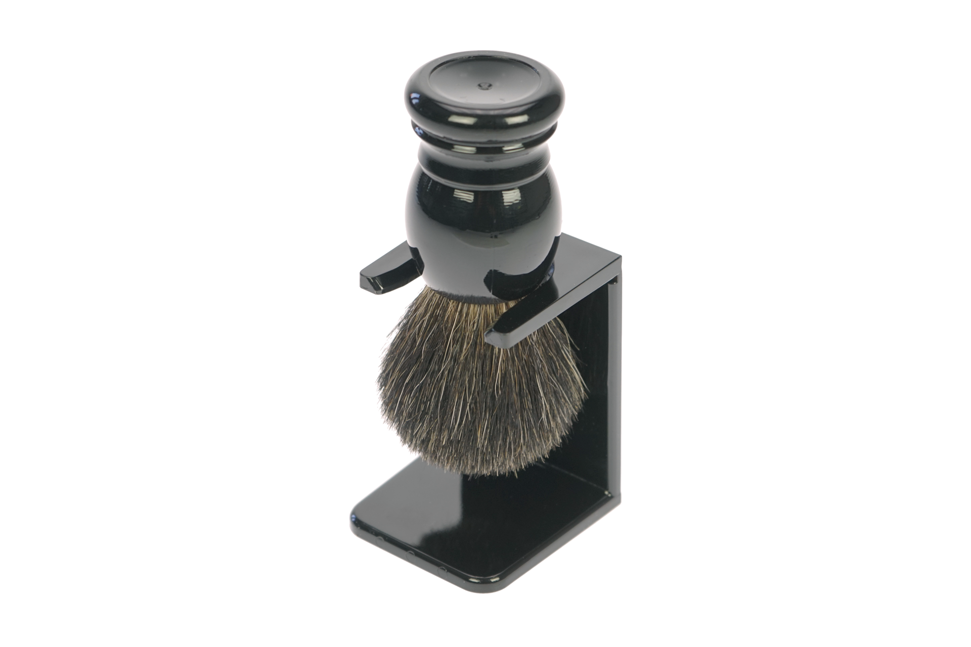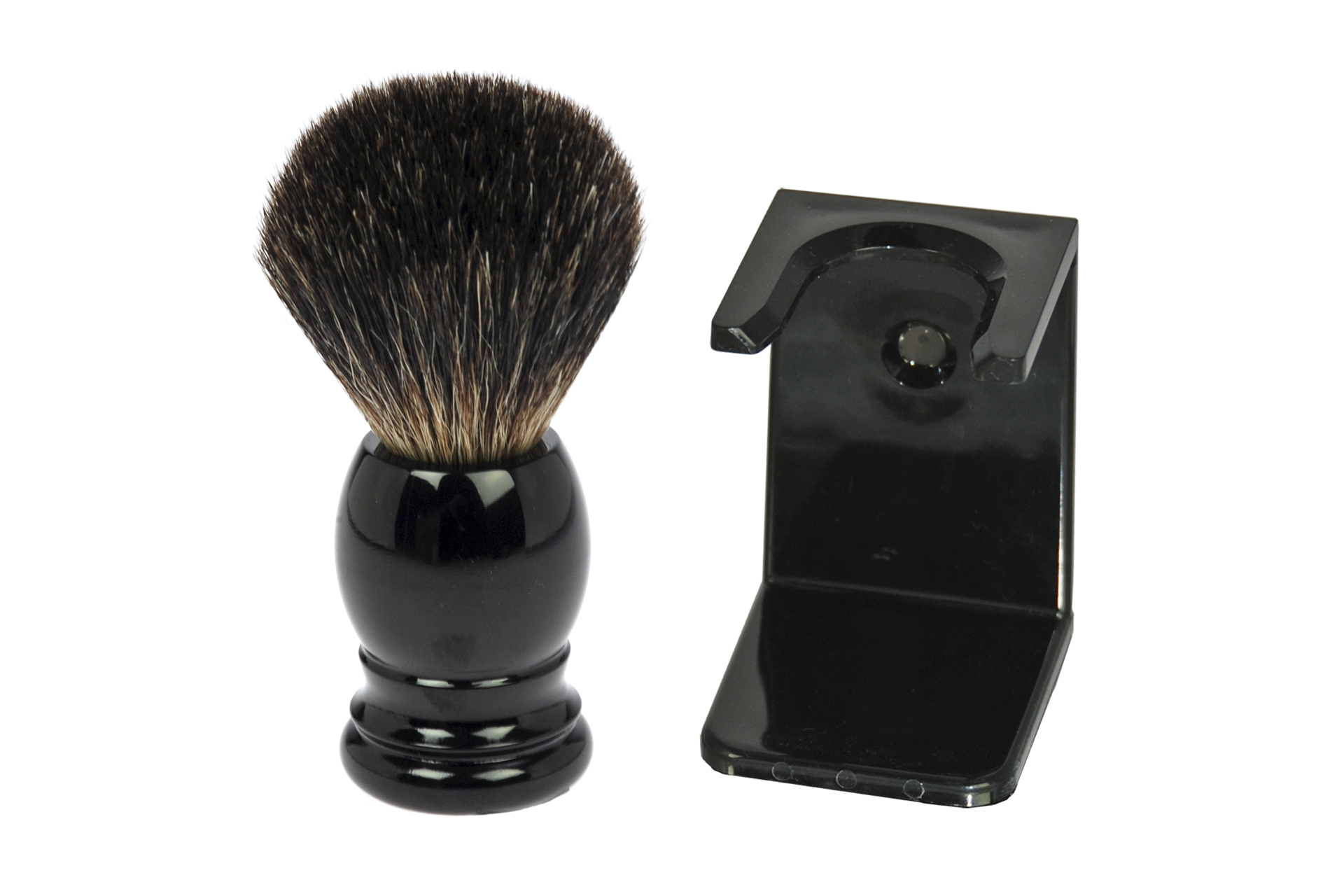The shaving brush holder made of black plastic not only provides a great presentation for your brush, but also ensures that it dries quickly and remains in the best condition. The shaving brush is made from badger hair. These hairs are known for their durability and their ability to absorb and hold water to create a rich and creamy lather. The handle is made of black plastic. Nice gift set for men.